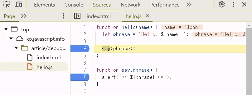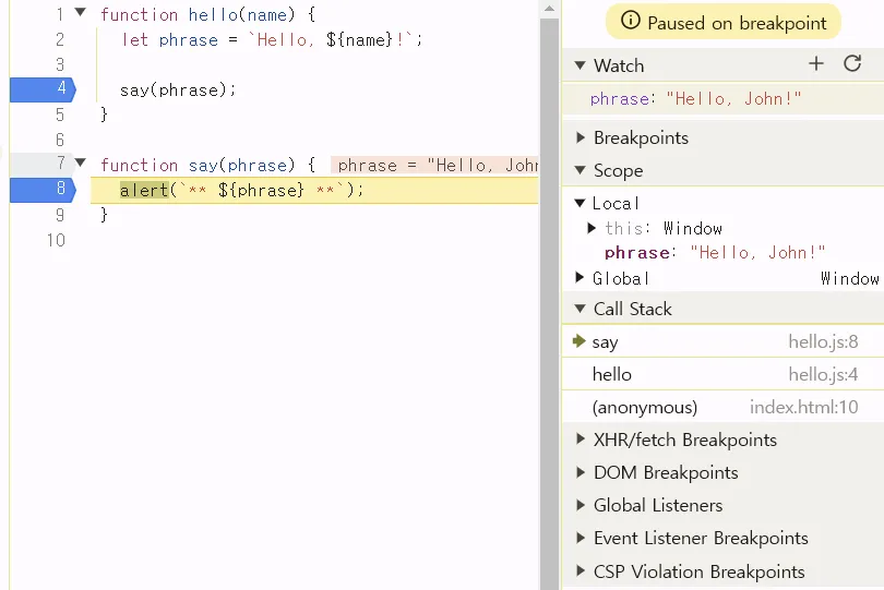 - 실행은 index.html 안에서 hello()를 호출하는 과정 중에 멈춘 상태이다.