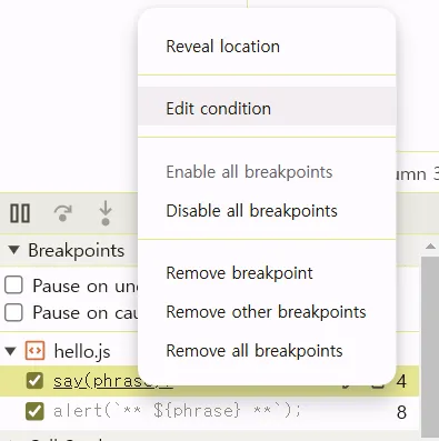 - 마우스 오른쪽 버튼을 클릭했을 때 나오는 ‘Remove breakpoint’ 옵션을 통해 중단점 삭제