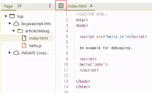 - Sources 탭을 클릭 패널(panel)을 연다.
