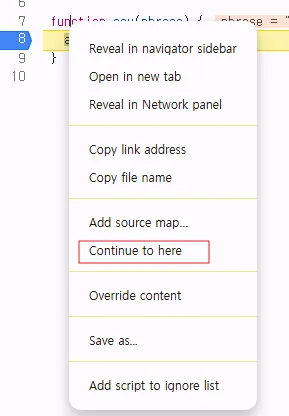 특정 줄에서 마우스 오른쪽 버튼을 클릭해 컨텍스트 메뉴를 열면 "Continue to here"라는 옵션을 볼 수 있다.